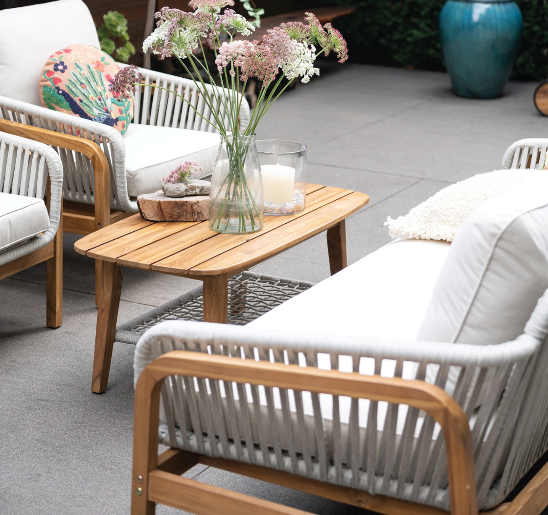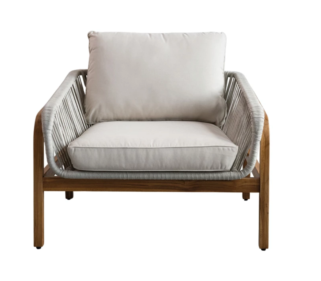 36-1/4"W x 30-3/4"D x 28-3/4"H Teakwood & Rope Wrapped Metal Indoor/Outdoor Chair w/ Cushions, Natural & White, Truck Ship
